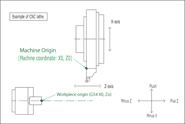 In most cases, the workpiece origin is set at the point where the machined end face intersects with the spindle centerline. The position of the workpiece origin is expressed by the coordinates X0 and Z0.