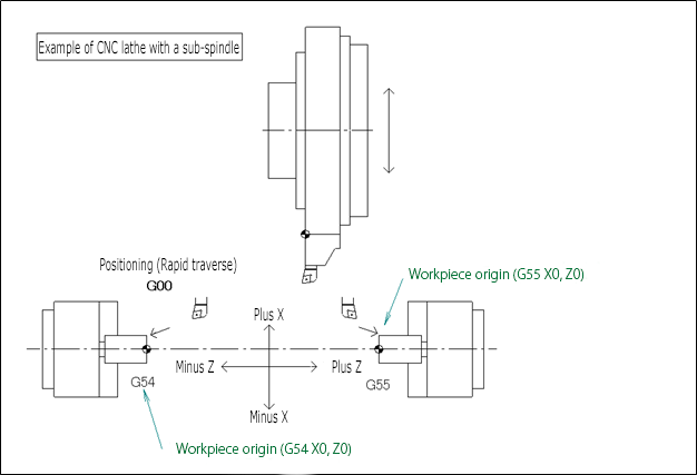 For machining on the sub-spindle, the second workpiece coordinate system, “G55 (Workpiece coordinate system 2 selection)”, is used. All coordinates are calculated based on this reference point. The positive and negative directions of the machine’s Z-axis follow the same basic definition as on the main spindle.